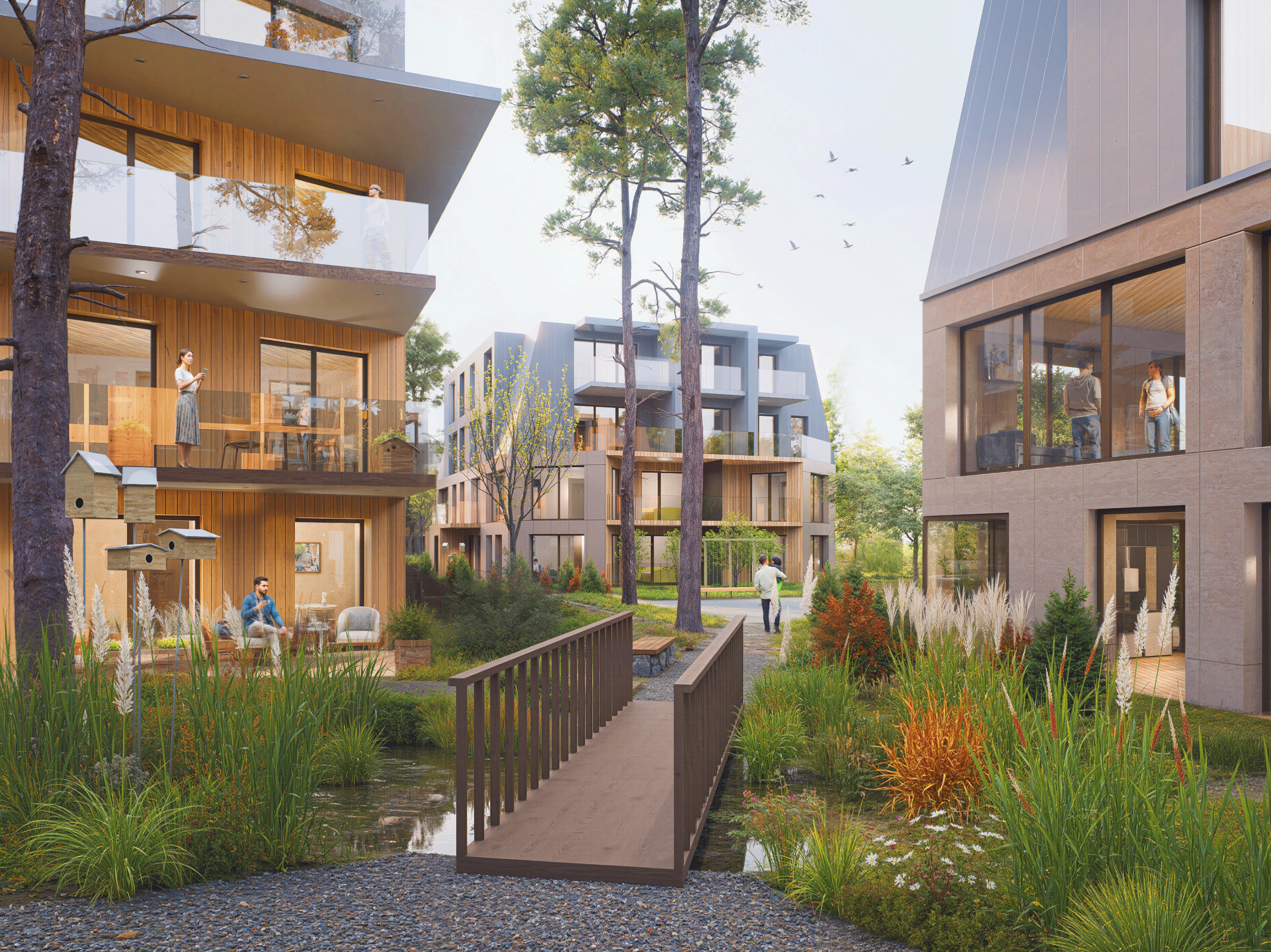 Alver toob välja, et eluruumid on tihedalt põimitud välialaga: “Kõik korterid saavad endale tugeva sideme välisruumiga, omades kas suurt terrassi või kaetud rõdu. Välisruumi jätkuv koridor liigub hoonete vahel pakkudes jätkuvaid vaatesuundi ja ühendusteid. Hoonete vahel tekkivates tühimikes paiknevad mänguväljakud, piknikualad, välijõusaalid või kogukonna kasvuhooned”.